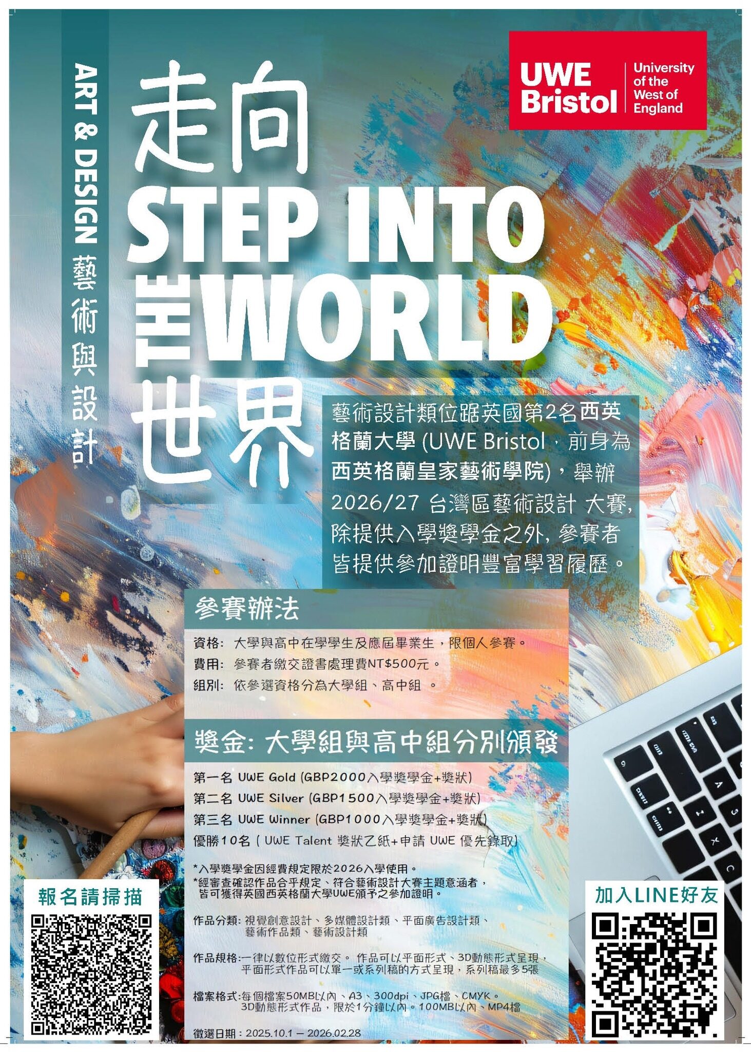 一、為增進台英雙邊藝術與設計交流,培養未來學子前進國際。藝術設計類位踞英國第2名的英國國立西英格蘭大學舉辦2026台灣區藝術設計大賽,除提供豐厚獎金之外,凡參賽者皆提供參加證明以豐富學習歷程與未來申請學校Portfolio。
