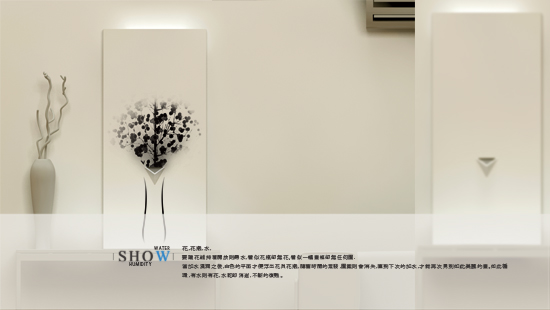 The Flowers, vase and water, These three elements play important roles to each other. We could see the relationships in this product. If we put the water into the hole, the empty canvas will start to show the flowers and vase. However, with the time passes away, the pattern will disappear as well. Until next water adding, then you can see this beauty scene again. By applying the principle of the“ Aquaphic Printing”, the color on the paper can be changed by water, we design this invisible and beautiful drawing. 花,花瓶,水,要讓花維持著開放則需水,看似一幅空白畫框,加水之後,便浮出花與花瓶,隨著時間的蒸發,圖案則則會消失,直到下次的加水,才能再次見到如此美麗的畫。利用水寫紙接觸到水則會變黑的原理,應用成產品的材質,當注入水的時候,表面會產生變化,如此不斷的循環,就好似一個迴圈,不斷的再生。