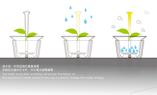 當我們澆水時,盆栽多餘的水提供水電池充電使用,提供植物照明,燈光隨著盆栽的水經過一天的吸收,透過盆栽重量的減輕來控制光源的開關。燈亮讓辦公室植物自行循環光合作用,不需要不環保的電池也不浪費電能。