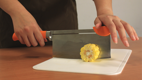 Movable Hilt是一款可雙手使用的菜刀改良,根據觀察,許多女性使用者力氣較小,在切帶有骨頭、冷凍肉品、瓜果類等較硬的食材時,經常需要第二個輔助的施力點,許多人會直接扶在尖銳的刀背上,然而這樣可能會造成手部的傷害。 “Movable Hilt” is a kitchen knife which can operate it with two hands. According to the observation, when cutting the meat with bones, the fruits, and freezing meat, there is a great deal of women who do not have enough strength to cut it by one hand. Therefore, they might press the knife with placing the other hand on the back of knife. However, the narrow space might cause another hurt on the hand. Movable Hilt菜刀在刀柄與刀背間,設置可移動的扶手塊,切較硬的食材時,可將扶手塊向前推到刀背頂端,即可扶在滑塊上使用免手掌被尖銳的刀背所傷。 “Movable Hilt” is a knife which places a movable “sliding piece” between the hilt and the back of knife. When facing the harder ingredients, move the “sliding piece” to the top of the knife. It could share the burden of the palm and lighten the pain on the hand.