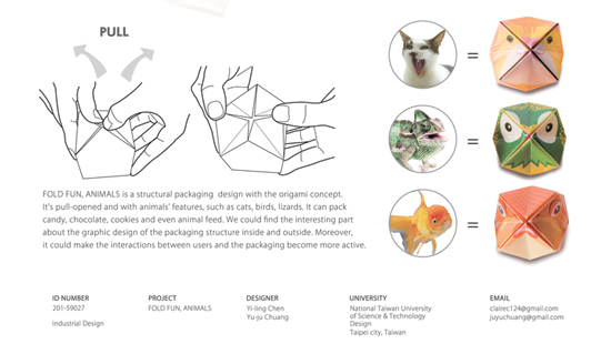 FOLD FUN, ANIMALS concept FOLD FUN, ANIMALS is a structural packaging design with the origami concept. It’s pull-opened and with animals’ features, such as cats, birds and lizards. It can pack candy, chocolate, cookies and even animal feed. We could find the interesting part about the graphic design of the packaging structure inside and outside. Moreover, it could make the interactions between users and the packaging become more active.