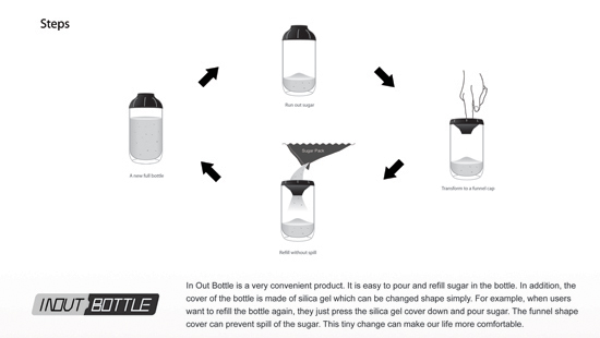 In Out Bottle In Out Bottle is a very convenient product. It is easy to pour and refill sugar in the bottle. In addition, the cover of the bottle is made of silica gel which can be changed shape simply. For example, when consumers want to refill the bottle again, they just press the silica gel cover down and pour sugar. The funnel shape cover can prevent spill of the sugar. This tiny change can make our life more comfortable.