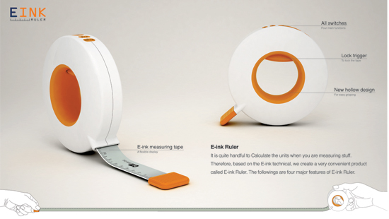 There are two main measuring units in the world: Metric and Imperial Units. Those two systems are totally different. Calculating the units is quite a handful. Based on this problem, we create a very convenient product called E-ink Ruler. There are four major features of E-ink Ruler. First, E-ink Ruler can change the unit immediately when consumers use it. Second, consumers can estimate the length of anything quickly. Third, it is very easy to divide a length into equal parts by adjusting E-ink Ruler’s Divide Button. Fourth, when it is circulated around a cylinder object, it can calculate the diameter and radius automatically.
