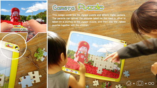 This design combines the Jigsaw puzzle and simple digital camera. The parents can upload the pictures taken on the road to office or taken on a journey to the Jigsaw puzzle, and then play the Jigsaw puzzles together with the children.
