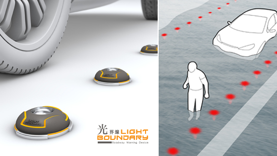 全球氣候變遷,近年來每逢大雨經常伴隨淹水的情況,暴漲的水位覆蓋了路面、溝渠與河道,導致行人和駕駛容易誤闖水深的區域而發生危險。 「光界線」是一個淹水時運作的路面警示裝置,主要是由水電池、水位感應器和LED所組成。平時由公路養護單位設置在鄰近溝渠或河岸的道路兩側,淹水時,裝置內的感應器一旦偵測到路面上的水位過高,「光界線」就會利用水電池與水反應所產生的電力從水下發出警示的紅光直達水面形成一道分界線,藉此區隔道路和非道路,協助用路人辨識安全的行進路線,避免落入水深的區域。 In recent years, heavy rain frequently brings flooding conditions. The water filled the entire road and ran above the gutter and the river. It caused pedestrians and drivers could easily fall into the deep water. “Light Boundary” is a roadway warning device designed for flooding conditions. It is made up of a water battery, a water level sensor and LEDs. This device was set along the gutter or the river by Highways Department. When the sensor senses the water level on the roadway is too high, Light Boundary will project red light on the water surface to form a visible borderline to help people identify safe area and avoid the accidents.