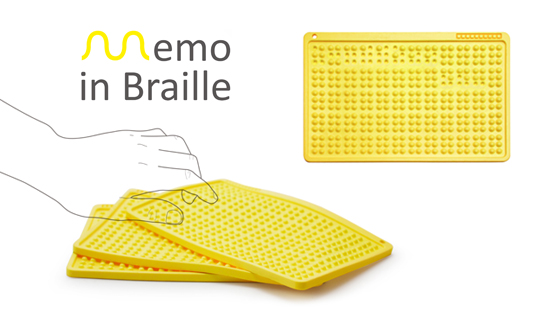 Memo in Braille是幫助視障者在日常生活中記事的用品。視障者使用的盲文必須靠凹凸的觸覺來辨識其中意義,然而在最簡單的生活中,他們不像正常人一般,可以隨手寫下簡短的文字記錄在便條紙或記事本上,他們沒有辦法自行利用盲文作快速簡易隨興的記事,Memo in Braille以此為出發點,以矽膠為材質陣列的凸點,可以讓視障者用手壓出盲文,以表面處理與造型讓視障者分辨正反與方向,是可以重複使用的盲文記事板,讓視障者在生活本質上更接近一般人也更獨立。 Concept: Memo in Braille helps the visually impaired to memo daily things by themselves. The visually impaired read Braille by feeling raised points. But in the simplest life, they cannot memo something quickly and easily like normal people with Braille. Memo in Braille is based on this concept. It is a reusable notepad for the visually impaired. It is made of silicone and has arrayed concavo-convex points for the visually impaired to press and write in Braille. The visually impaired can recognize the directions by the unsymmetrical shape and different surface treatments on two sides. Memo in Braille make the visually impaired more independent and closer to general people in the foundation of life.