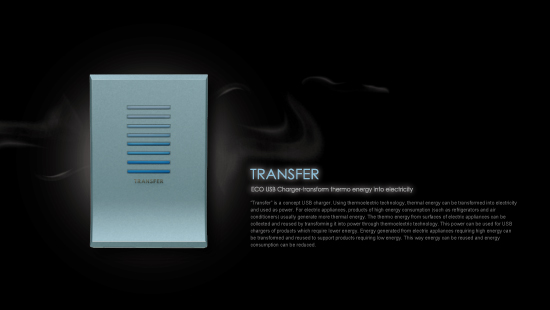 “TRANSFER”為概念式USB充電座,運用熱電科技,將熱能轉化成電能使用。在家電產品中,越高耗能的產品其運作時產生的多餘熱能越多,(如冷氣、冰箱等),TRANSFER便是利用電器用品使用時表面散發的熱,以熱電效應技術,將多餘熱能轉化成為電能,供家中較低耗能,只需利用USB充電之產品使用,藉由高耗能家電產生的能量,重複利用轉化,支援其他低耗能產品,讓能量能有效的重複利用,降低能源消耗。