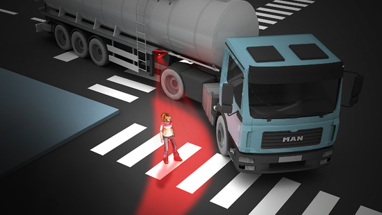 The roads of the Germany witness over 300,000 truck accidents each year. And 30% of all accidents are caused because of inside radius. When tractor trailer truck or container truck turn left or right on the corner of street, their rear wheels’ inside radius will move and make a deadly curved area. Therefore, it is extremely hazardous when pedestrians and smaller vehicles next to the big trucks. Based on that problem, we create a new turning indicator called, Red Hazard, It not only horns beep but also projects the red light on the ground to indicate which area is dangerous for pedestrians on the corner. The Red Hazard is installed in front of the both sides of rear wheels. In order to notice the pedestrians and smaller vehicles next to truck, it will horn beep while turning. In addition, when the truck makes the left turn, Red Hazard will emit a red curved triangle shape on left side, and vice versa. This red area indicates where the rear wheels will go through.