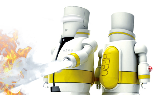 Hero是針對居家形式所設計的消防保全機器人,藉由主動式的機動巡防,達到消防及保全的目的,解決目前被動式的消防裝置及防盜系統其應變能力不佳的問題,有效預防和抑止火災及竊盜案件的發生。以下為設計特點: (1)Hero在功能上兼具滅火及保全雙重需求,並具備自動補給能源的機制,使機器人在執勤時不受限於能源不足的干擾。 (2)Hero外觀造型主要擷取至警消人員的裝備形式及色彩象徵,除傳達出打火英雄的形象,也強調出機器人本身具備消防安全之功能。 (3)Hero面部LED高亮度的色光可顯示當時使用模式與狀態,能與使用者有良好直接的人機溝通管道。