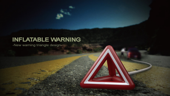 當車輛發生事故時,依規定必須放置三角警示立牌告知後方來車 避免追撞意外發生,警示立牌必須放置於車輛後方100公尺處, 以免追撞意外發生─ warning triangle利用震動發電原理,提供產品所需要之能源, 平時裝置於車輛底盤後方,在事故發生時可快速將充氣式三角警示 立牌投出至後方約100公尺處,達到快速警示的作用,不需再以步行的 方式放置立牌,節省設置三角警示立牌所耗費的時間與降低危險性, 讓駕駛有更安全的保障