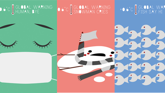 設計理念 就在全球暖化日益嚴重的當下,全球的平均氣溫已比上個世紀上升了0.6度C。這個系列海報主題為Global warning 取自於 Global warming的諧音,首先由融化的雪人扮演了告知我們這個global warning的角色。原先是戴在雪人身上的圍巾,在這個global warming的時刻也成為他舉白旗的工具了。雪人,對於地處亞熱帶地區台灣的小孩是從小夢寐以求的一項大自然的玩具,有一天是否雪人也會面臨絕種的問題? 而我們也再也沒機會接觸雪,這樣來自上天的禮物。 第二張海報是海平面上升後的結果,原先的陸地,取而代之地成為了海水,人類的家變小了,反之魚群的家變大了。第三張海報是溫室效應最終造成的結果,人類得向世界說掰掰。臉上還掛著的口罩似乎述說著造成溫室效應的真兇之一。 As global warming becomes much more serious, the average temperature has increased by 0.6 degrees compared to the last century. The caption of this series of posters is “Global Warning,” similar to “global warming”. First of all, the snowman plays the role of who notifies us of a “global warning.” The scarf that the snowman used to wear has now become a white flag as the means of surrender during the crisis of global warming. For kids who live in subtropical area, like my hometown, Taiwan, a snowman is the ideal toy of Nature in their dreams. Will there be a day when snowmen face the problem of extinction, and we will have no more chances to be exposed to snow, the gift from God? The second poster mentions that global warming causes sea-level rise. Lands are replaced by sea. People’s homes are becoming smaller; whereas, the fish’s home are bigger than before. The truth is we already destroyed natural balance. The third poster presents the final result of global warming: Human will die having to say goodbye to the world. The mask covering the face seems to insinuate one of the murderers who committed global warming.