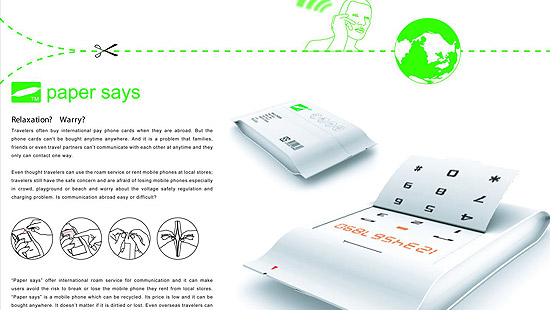 〝Paper says〞利用國際漫遊的通訊方式,卻不必擔心原有或承租的手機受損或遺失,可回收式的手機,價格低、易購買,弄髒了弄丟了也無妨, 也不必牽就電話亭的位置,即使在國外溝通也能隨時隨地。購買替換方便,在各國當地的公營單位〈機場、博物館‧‧‧〉私營機構〈街邊商店、超商、品牌商店‧‧‧〉公開性活動〈奧運、嘉年華會、百老匯‧‧‧〉販賣機‧‧‧等都可以輕易的購買。