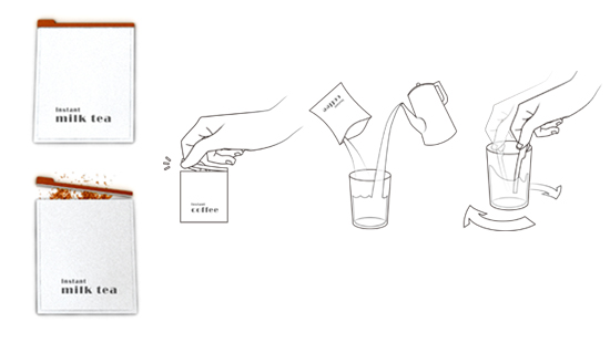 Stick Package The concept design integrates the stick and the package. When we tear the package of instant drink, the torn part of the package will function as a stick. The powder can easily dissolve in hot water by stirring with the stick. It reduces the remnants in the bottom of cup and we can fully enjoy the flavor and the convenience of instant drink.