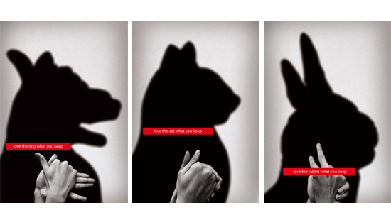 Dogs, cats and rabbits are the pets which are the most frequent house pets in our real life. The main reason that pet owners select them for keeping is they are cute looking pets. However, pet owners sometimes encounter the difficulty of keeping them, and even abandon them finally. The only thing we can make sure is pet owners should not do that. In fact, the relationship between pets and pet owners is like hands and shadows as shown in the posts. When pet owners keep them, their lives will be held in the hands of pet owners. Therefore, we have to love the pets and should not abandon them. 狗、貓和兔子是社會中最常被飼養的寵物。起初,人們選擇了他們可愛的外型作為飼養。而後,有時卻因遭遇困難,無法負起責任導致棄養了牠們。這種現象是不應該被允許的。寵物和飼主的關係,好比如同影子和手的關係。當飼養牠們那一刻的開始,牠們的生命已經掌握在我們手中。所以為了下一代的教育、社會和環境,如果愛牠,就不要棄養牠。