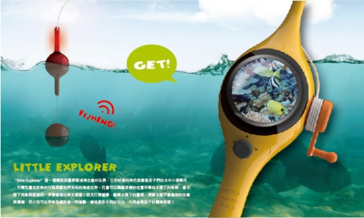 Little Explore” is a toy which helps children to explore ecology of shallow sea. The role it plays is like a little scout in the water, guiding children through fishing to explore underwater world which they have never seen. Children can move the location of the buoy to look for fish in the water. When fish pass by, the light in the buoy goes on to remind children to turn on the screen so that they can see what is in the water and explore ecology and environment of animals and plants underwater. Parents can be beside their children to guide them through this game, participating in their children’s adventures! “Little Explorer”是一個幫助孩童探索淺海生態的玩具,它所扮演的角色就像是孩子們的水中小偵察兵,引導兒童從釣魚的行為探索他們未知的海底世界。兒童可以操縱浮標的位置來尋找水中的魚群,當有魚群經過時,浮標會發出亮光提醒小朋友打開螢幕,觀察水面下的畫面、探索水中動植物的生態與環境,而父母可在旁做為輔助者一同遊戲,共同參與孩子的冒險旅程!
