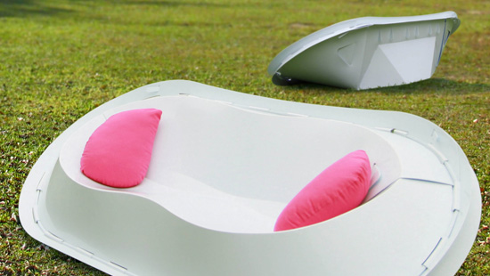 The Peanut Sofa is made with two sheets of plain polypropylene–a recyclable and low-cost material. The polypropylene sheets that compose the Peanut Sofa are just 3mm and 10mm thick, but the folding technique applied to them generates a structural geometry that is suitable for supporting the body’s weight. The sheets are cut using the CNC milling technique (which requires few resources), and are folded and interlocked to create the sofa form. The lower sheet acts as base and the upper one acts as a seat and back support. The self-lock structure enables the user to assemble the sofa without any fasteners or accessories. The polypropylene sheets can be efficiently stored and transported in their unfolded state. The disassembled sofa can be easily recycled at the end of its life. The use of a single material enhances the sofa’s recyclability. Peanut Sofa是由兩張PP板材料上下結合而成的沙發椅,一張為上層的椅面、一張為下層的基座,透過折線設計的摺疊方式,在單張的外圍各產生具一定強度的結構,當使用者坐在椅面上時,力量皆會傳達到椅面橢圓形的外框,而基座橢圓形外框必給予椅面一反作用力,當作用力與反作用力作用在同一橢圓形的外框上,再將力量傳達至地板,達到支撐的作用;共可乘坐2~3人,因為外型與結構都和花生的形狀與外殼結構非常相似,因此取名為Peanut Sofa。
