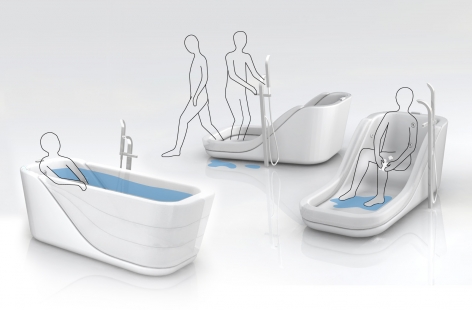 浴缸邊緣的高度以及潮濕的環境造成使用者在跨出浴缸時,極容易發生跌落或滑倒的情況,尤其對高齡者或是行動不方便的人更是一種困擾。此概念將半邊的浴缸設計為可充氣材質,並利用管線配置與按摩浴缸原本的馬達共用,進行充氣與洩氣。洩氣後,減少了浴缸與地面的段差,使用者即可輕易的跨越浴缸。除此之外,充氣浴缸也提供一種更加節省空間的選擇,除了泡澡外,平常時也可以做為淋浴空間與洗澡椅的功用,妥善利用空間,並同時保持浴室地面乾燥。此概念讓潛藏危險性的浴室空間更加安全並且讓使用情境能更加方便。