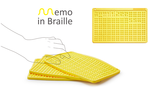 中文概念: Memo in Braille是幫助視障者在日常生活中記事的用品。視障者使用的盲文必須靠凹凸的觸覺來辨識其中意義,然而在最簡單的生活中,他們不像正常人一般,可以隨手寫下簡短的文字記錄在便條紙或記事本上,他們沒有辦法自行利用盲文作快速簡易隨興的記事,Memo in Braille以此為出發點,以矽膠為材質陣列的凸點,可以讓視障者用手壓出盲文,以表面處理與造型讓視障者分辨正反與方向,是可以重複使用的盲文記事板,讓視障者在生活本質上更接近一般人也更獨立。 Concept: Memo in Braille helps the visually impaired to memo daily things by themselves. The visually impaired read Braille by feeling raised points. But in the simplest life, they cannot memo something quickly and easily like normal people with Braille. Memo in Braille is based on this concept. It is a reusable notepad for the visually impaired. It is made of silicone and has arrayed concavo-convex points for the visually impaired to press and write in Braille. The visually impaired can recognize the directions by the unsymmetrical shape and different surface treatments on two sides. Memo in Braille make the visually impaired more independent and closer to general people in the foundation of life.