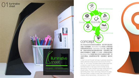 為了和地球共存共榮與永續發展,尋求替代能源成為當下首要趨勢,Illuminative Sheet提供人們簡單達到環保精神的訴求。 Illuminative Sheet是一個結合轉能、節能與創能的新型態環保燈具,利用薄型太陽能板及有機發光二極體(OLED)技術,將薄如紙張的lluminativeSheet放置於陽光照射之處為其充電,待完成充電後,透過簡單的折彎,就能變成一盞照明燈具! In order to live with the earth and keep it sustainably developing, seeking alternative energy sources has become the primary trend at the moment. Illuminative Sheet provides people with a simple tip to reach the spirit of environmental protection. Illuminative Sheet is a new type of environmentally friendly lighting which include of transferring energy, energy saving and energy creating. The use of thin solar panels and organic light-emitting diode ( OLED ) technology. Putting the thin paper Illuminative Sheet in sunlight to charge. After completing the charging, witha simple bending, it can become a lighting!