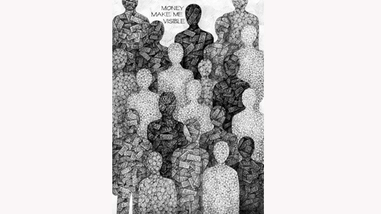 Even though we are living in a society of plural values, it is hard to deny that how much you have in the pocket defines the amount of attention you get. We know that 80% of global wealth is owned by 20% of people and those people are like the four characters with thousand-dollar cash sticking all over them in the pictures──so valuable and visible. As for the other 80% of people, as their pockets get lighter they get smaller and more invisible. No matter that money is nothing more than papers or coins, or how negligible the actual weight it is, or how less it represents a person, each person in the picture is troubled by different financial problems which shows that money has dominated us, controlled the way people judge us, and occupied our lives. I have money, so they see me and they take me seriously.
