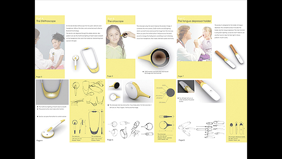 Dr. Donald即是在改善這樣的問題與需求下所設計的產品,它是一套包含了聽診器、耳鏡和壓舌棒柄三項物件的小兒耳鼻喉科看診用具。