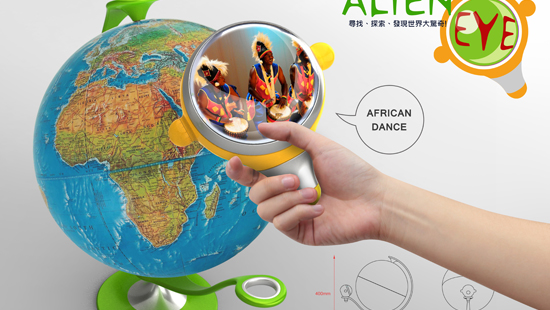 Alien Eye is a learning toy for children around the age of 3~8. It's a device that use the Cloud technology to connect to the internet and children can learn about different themes like culture, people, animals, plants and buildings in different location around the world using simple and interesting way. Alien Eye contains 2 parts, one is a observation device another is a terrestrial globe with RFID build in it. First, children can take the observation device and look at different places on the terrestrial globe. Then, the observation device will read the RFID code in the terrestrial globe and link to the internet to search the pictures that match the RFID code. After that, the observation device will shows those