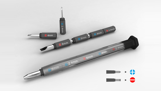 “Tools-pen” is a combination of different screw drivers in the form of Rainbow pen. It is small and easy to carry. Users only need to bring this Tools-pen and they are able to use multiple screw drivers at the same time. It is as easy as changing the color from a rainbow pen.