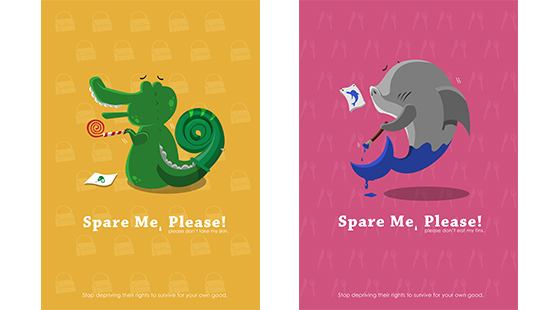 此海報以鱷魚皮為概念,以幽默的手法來表現;鱷魚為了要生存而將自己裝扮成神祕的變色龍,希望自己的皮不再被剝奪。