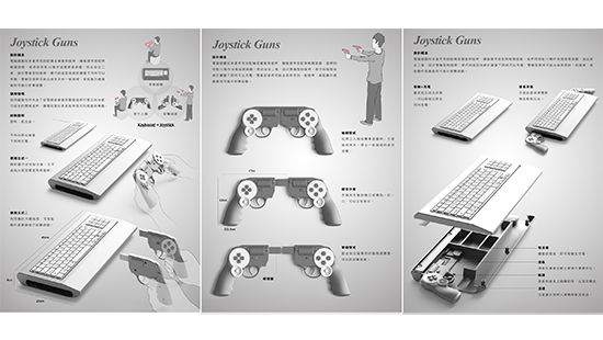 因此結合二者,設計雙槍型的搖桿,精巧的造型收納於鍵盤下同時可以充電。雙槍型搖桿可結合成常用的