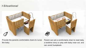 “Cot chair” provides comfortable chair for parents when taking care of baby near the baby cot. The height of chair and baby bed is suitable for parents action.