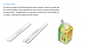 It's often for people to drink beverage via straws; however, straws are made with PVC and PP plastics. These materials not only consume sources but also pollute the environment. Foldable Straw is composed of a straw and a straw sheath out of a paper, reducing both wastes and bulk volume.