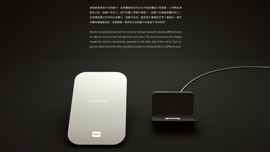 透過網路連結不同的鏡子,訊息傳遞來自於生活中最直覺留下的痕跡,使用者能夠透過自己的一面鏡子與自己、與不同鏡子間進行溝通。一面鏡子記錄最真實的自己,記錄潛意識中所有的行為舉止。鏡子的另一端是什麼樣的世界?透過鏡子的另一端傳來最細微的信息,我將透過一面具有生命的鏡子來連結不同的世界。