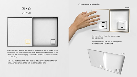 A switch or a button represents [in/out] between turning on and turning off. While pushing the button, concavity and convexity, which illustrate the function “switch” frankly. And at the moment we turn it on, we may also recall the memory of turning off. By the attribution of these exchanging, we made the interface become more friendly and divinatory. In functions, we expand the area of the buttons for pressing more easily. Basing on the prototype of the rectangular panel of the button and socket, we use the concavity and convexity to represent [in/out]. We also combine the button and the socket for province electricity. With the buttons, the user can stop consuming the electricity without pulling the plug. When we getting into the house, there’s a button which seems to open an chamber of secrets by its notice of light and “concavity and convexity” on the wall.After you push it excitedly, there’s an exchange between “in” and “out” while the room becomes bright. Emotionally, the “concavity and convexity” on the wall just like a secret button to open a treasure, and this treasure are a brand-new brightness and space.