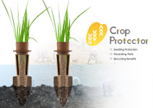 Crop Protector 是可防止秧苗受福壽螺侵害與避免傾倒,及提供養分的秧苗固樁釘。外殼以稻稈纖維製成,可穩固秧苗基底,防止強風時傾倒;頂部則添加米糠與苦茶粕混合製成,可降低福壽螺的侵害,以利秧苗初期的生長。而自於農業廢棄物的稻稈、米糠及苦茶粕富含大量的營養物質,分解於土壤中可做為有機肥幫助秧苗生長,進而達到友善的循環種植。Crop Protector可單獨作為手工插秧與拋秧使用,也連結成盤狀形式用於機械插秧上,提供各地區的差異化種植需求。