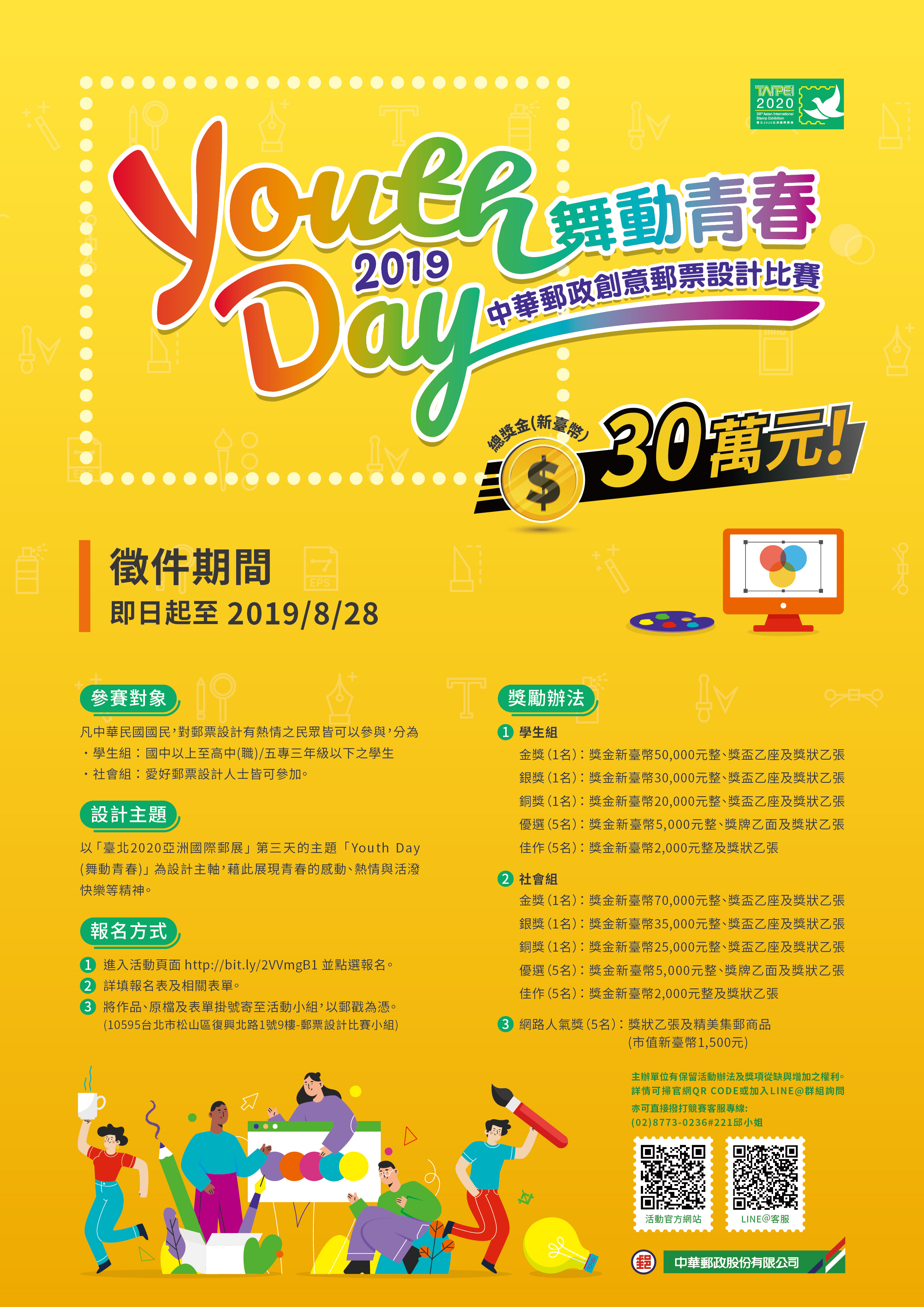 活動主題:以「臺北2020亞洲國際郵展」第三天的主題「Youth Day(舞動青春)」為設計主軸,藉此展現青春的感動、熱情與活潑快樂等精神。